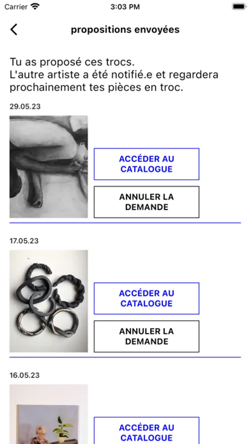 For one of his coveted pieces, the artist owner receives a notification in his "received proposals" section. He has a direct access to your pieces in barter, can then look at them and choose one.