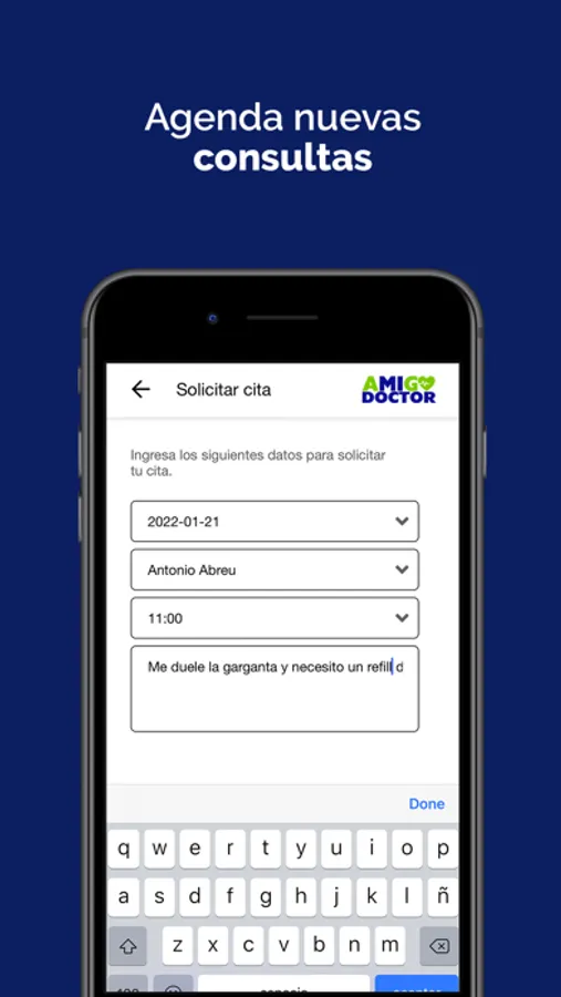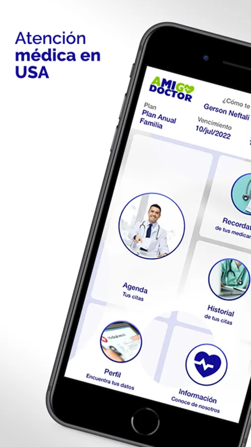 En la App de Amigo Doctor encontraras lo fácil que es agendar una consulta médica en el horario que elijas, también podrás ver el historial de las mismas, poner recordatorios para tus medicamentos, recibir notificaciones para acudir por tus medicamentos a la farmacia que elijas, un chat en vivo pare resolver todas tus dudas y sobre todo una atención en español.