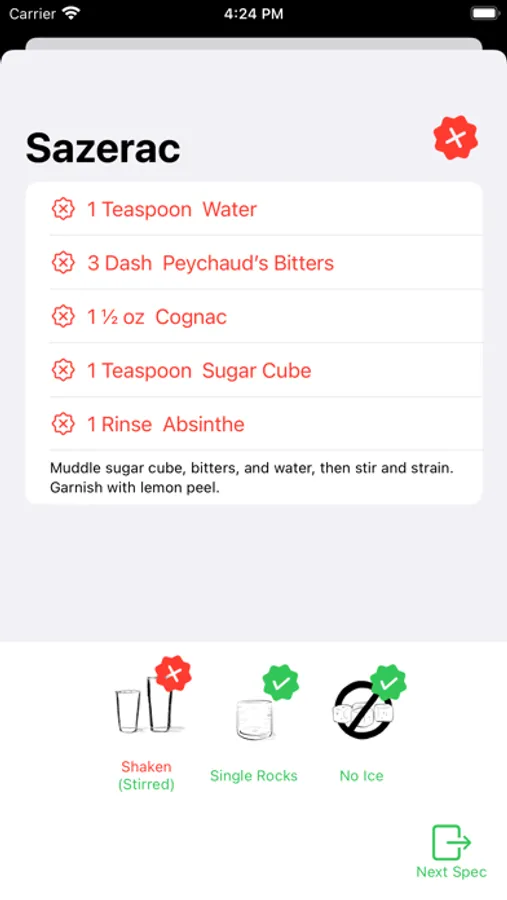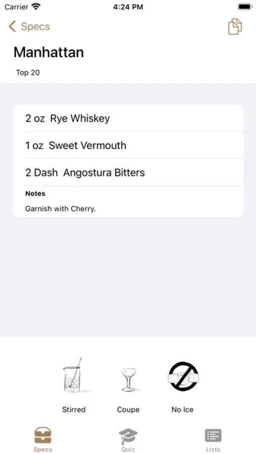 This app is made for those of us who'd like to memorize a library of cocktails - maybe just the classics so you can move faster when a customer throws you a curveball, or perhaps you're starting your career at one of those fancy manhattan speakeasies and you need to memorize a new menu every season. Or perhaps, like me, you're just an enthusiast who wants to have a spec for every palate on hand without going to the bookshelf.