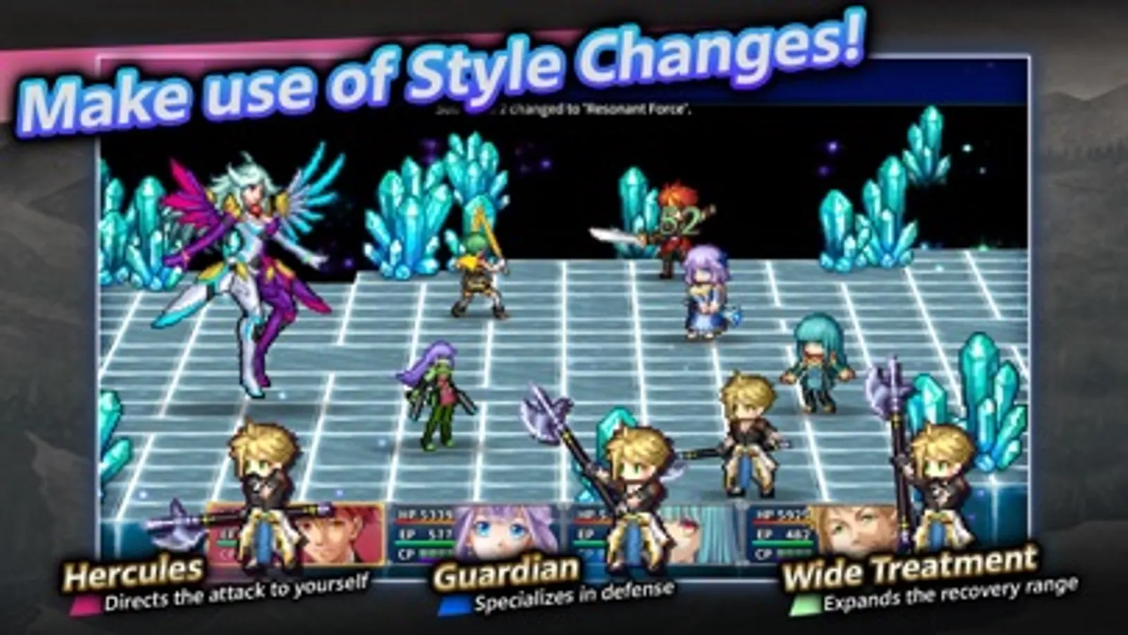 Use up to three styles for each character in turn-based battles to get benefits from recovery to fighting styles. Increase Energi levels by raising multiple elementals unique to the Alphadia series and learn new skills. The combo skill called Resonant Skill is also the key to victory.