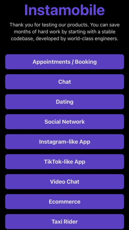 Instamobile provides ready to use codebases to help developers jumpstart the native development of their apps. This flagship iOS app allows software developers to check out our codebases in action, so you can get an idea of what the source code is as well as get the look and feel of the features in a real app.