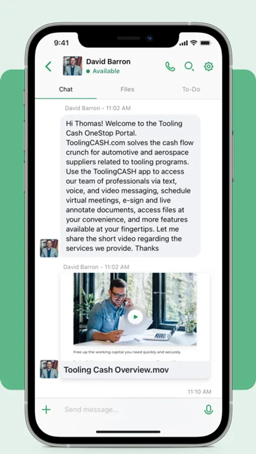 ToolingCASH.com solves the cash flow crunch for automotive and aerospace suppliers related to tooling programs. Use the ToolingCASH app to access our team of professionals via text, voice, and video messaging, schedule virtual meetings, e-sign and live annotate documents, access files at your convenience, and more features available at your fingertips.