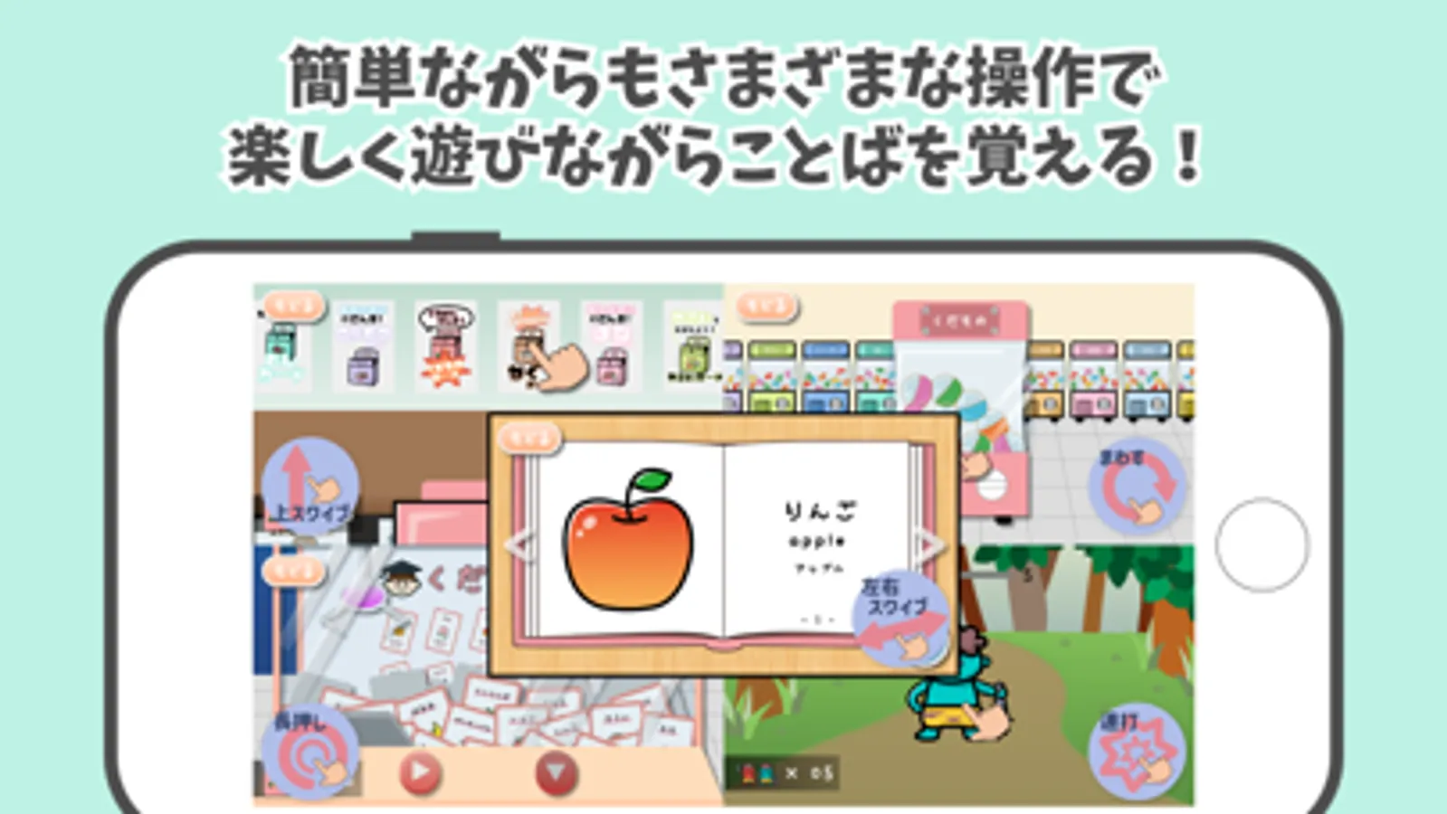 貰えたりと繰り返し遊べる仕組みを用意しているため、覚えたことば(ひらがなとえいご)の定着を期待する事が出来ます。