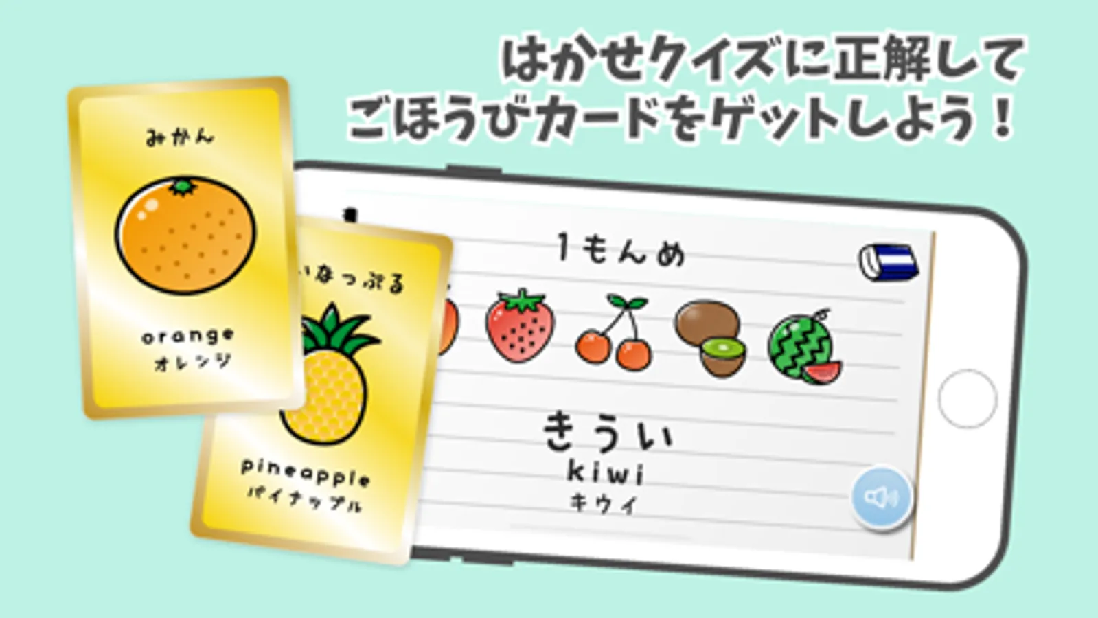 「くだもの」や「やさい」等にカテゴライズされた10種類のことば(ひらがなとえいご)を絵本を見たり、カードを引いたりしながら楽しく学べます。