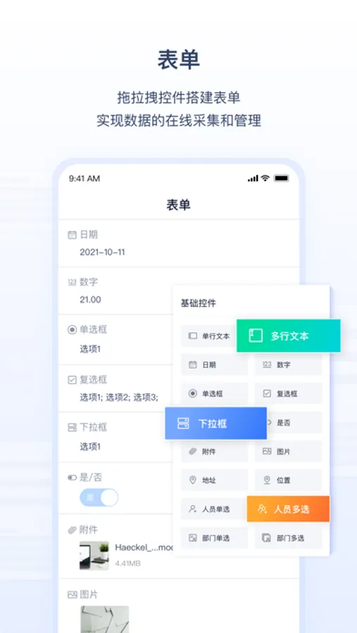 丰富的字段类型,满足多种填写场 景,让企业随心所欲创建表单;强大的数据联动、关联填充、子表关联、跨表单数据关联等逻辑规则,在高可用的同时,提供强大的功能支持