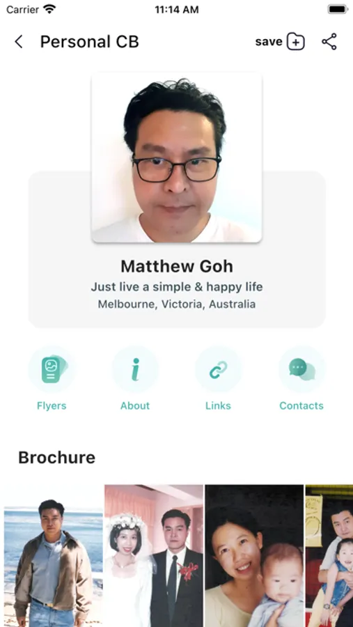 The brochure consists of uploaded pictures (9:16 format) to present the company, or personal photo album. User fully controls how he or she wants the CB to be presented.