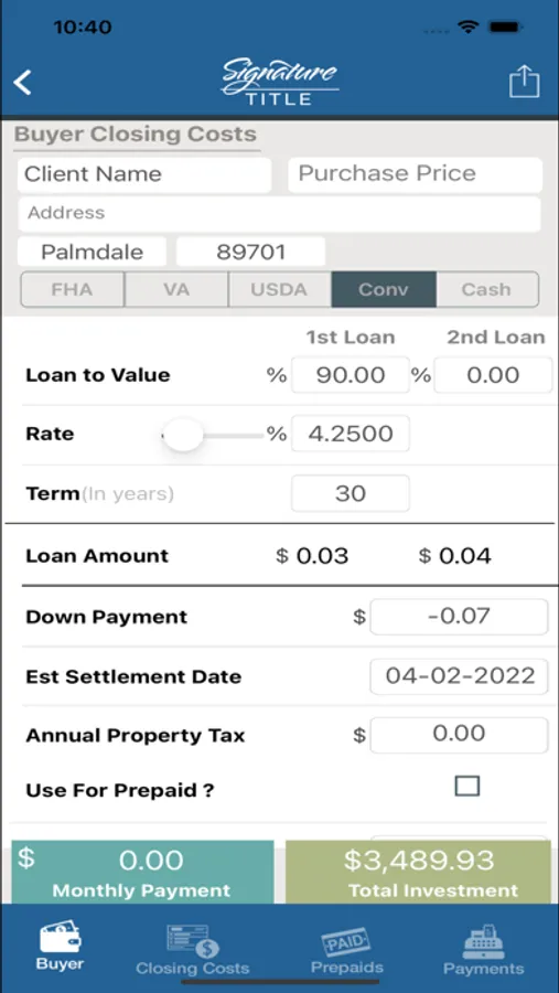 Signature Title Bottomline Closing Cost program calculates closing costs for FHA, VA, Conventional loans, and Cash Transactions. Users can use their existing Signature Title Bottomline login from the Signature Title Bottomline Web application and through Cloud Services; have access to their Saved files. New Users can create a Signature Title Bottomline account on their iPhone and use that account from their PC/Mac or Tablet web browser.