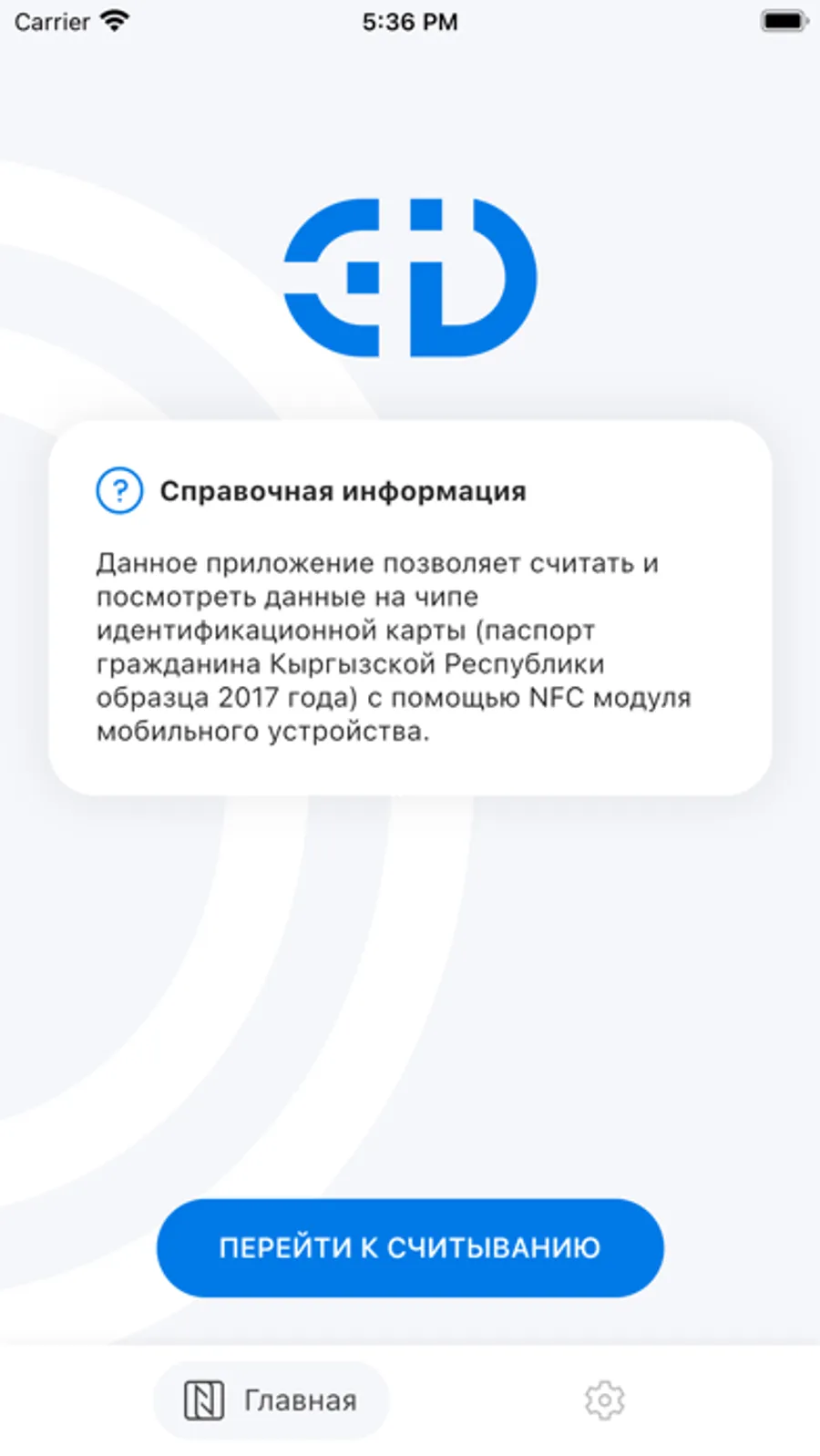 «eID считыватель» - это мобильное приложение для считывания данных, находящихся на чипе идентификационной карты (паспорт гражданина Кыргызской Республики образца 2017 года), с помощью NFC модуля мобильного устройства.