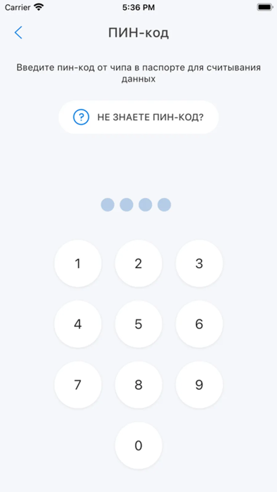 Для считывания данных необходимо ввести секретный 4-х значный код (пин-код) от чипа в паспорте.
