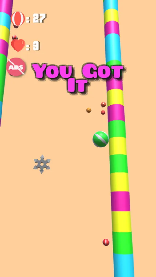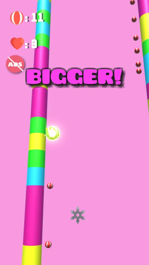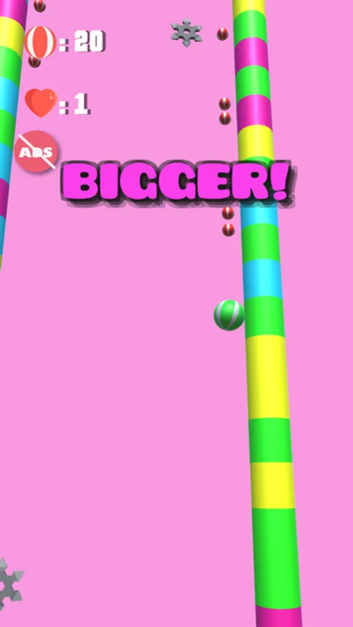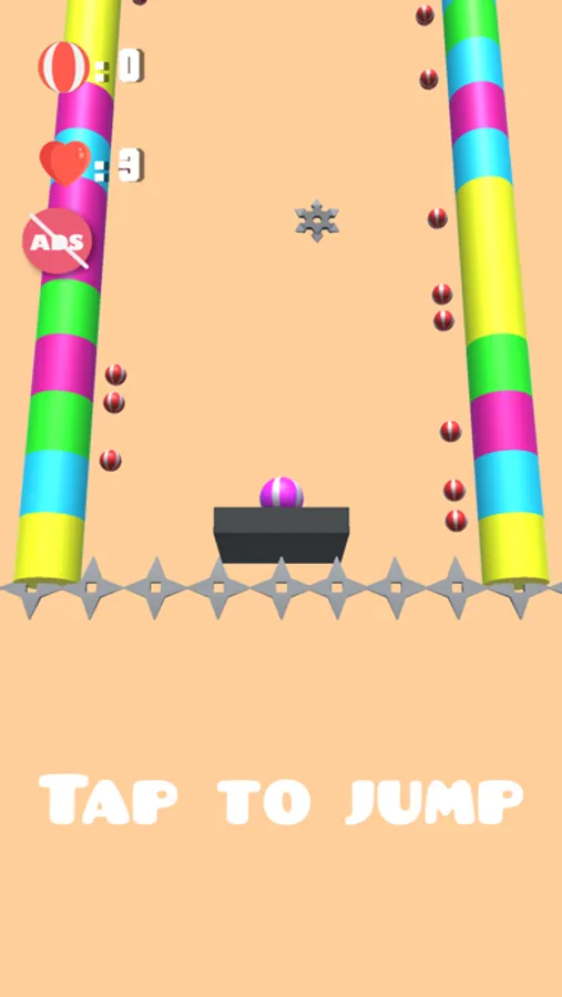 Jump between two rollers and collect small balls to grow and reach the top! In the meantime, try not to get caught by the ninja stars. Just tap the screen to jump and tap again to hold on. Remember, you can only hold on to sections of the same color as the ball.
