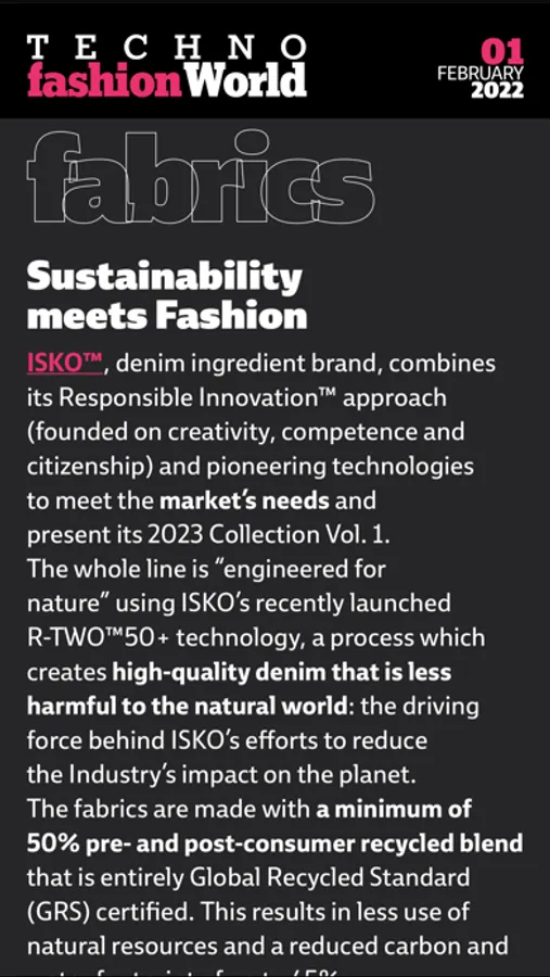 Technofashion is the only integrated multi-channel platform (print magazine, website, social network and all other digital interaction tools) of reference for technologies of Textile & Fashion Apparel.