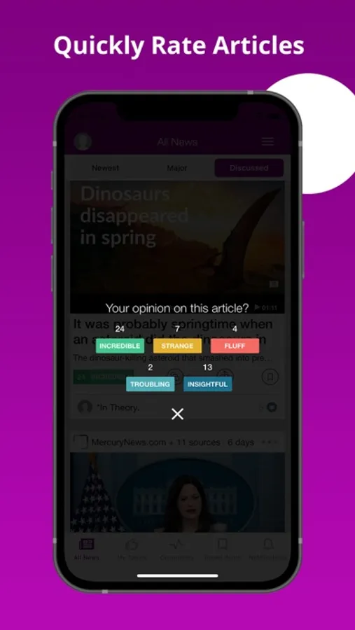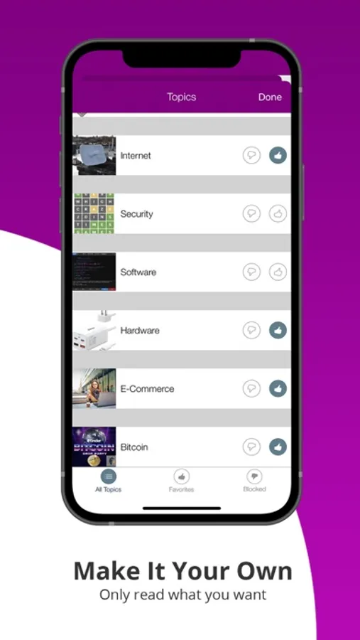 - Your very own news feed - choose the topics you want to follow and the topics you want to block - long tap a story to block the source