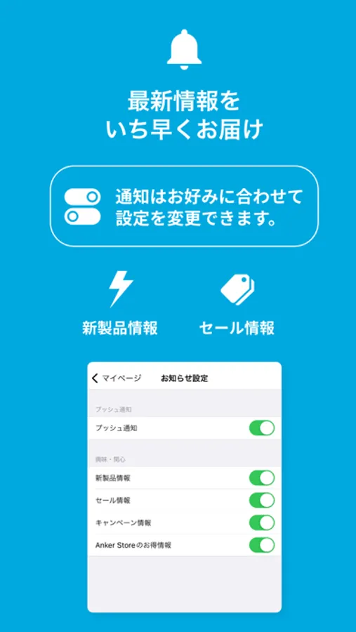 Anker Japanからのお知らせや新製品情報、キャンペーン情報などの配信をお客様のお好みに合わせて設定できます。