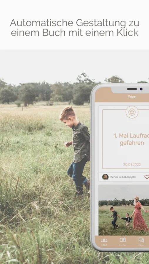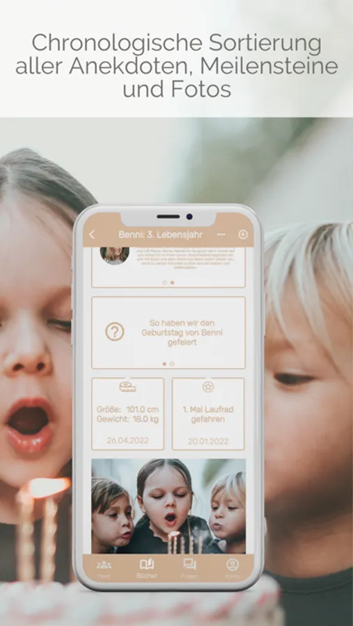 Willkommen bei memooa, der ultimativen App, die Dir hilft, die unvergesslichen Momente der Kindheit Deiner Kleinen für immer festzuhalten! Mit memooa kannst Du mühelos und liebevoll die einzigartige Reise Deines Kindes von der Geburt bis zum 12. Geburtstag dokumentieren – alles in einem bezaubernden digitalen Album, aber auch als gedrucktes Buch.