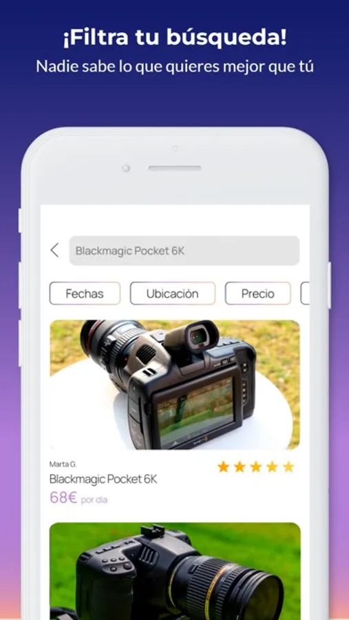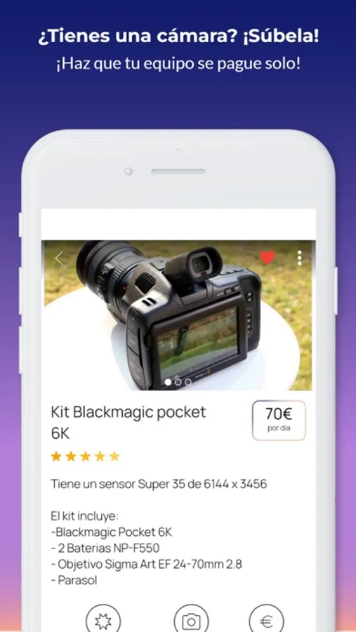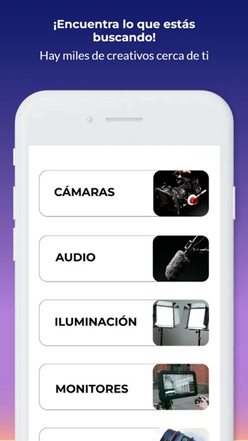 Descárgate la app y encuentra a profesionales cerca tuyo que alquilan cámaras, ópticas, luces, sonido y/o cualquier equipo que necesites para tu próximo proyecto.