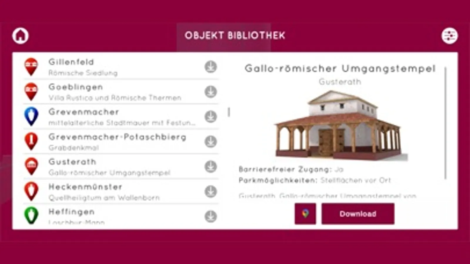 Let yourself be guided to the archaeological monuments of the Greater Region of Rhineland-Palatinate and Luxembourg! Thanks to Augmented Reality, your mobile device brings archaeological sites to life. On-site, you can explore historical objects displayed in the real landscape in their original size. The ARGO app allows for an accurate and location-independent view of a monument. You can view it from all sides, approach or move away - the view will always be automatically adjusted to your position. A one-time download is sufficient, no reloading is required, and therefore no internet connection is necessary. This app is provided to you free of charge. Plan your trip using our route planner at ar-route.eu and download the app to your smartphone or tablet. Discover over 100 life-size 3D models on-site.