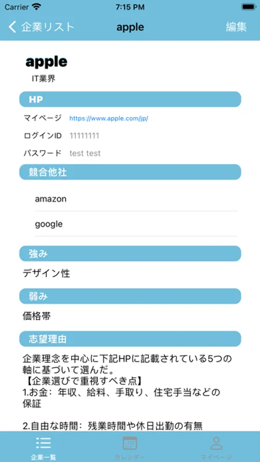 強み、弱み、競合他者、志望理由、ESの内容を企業ごとに管理可能