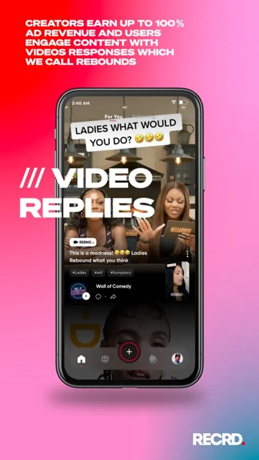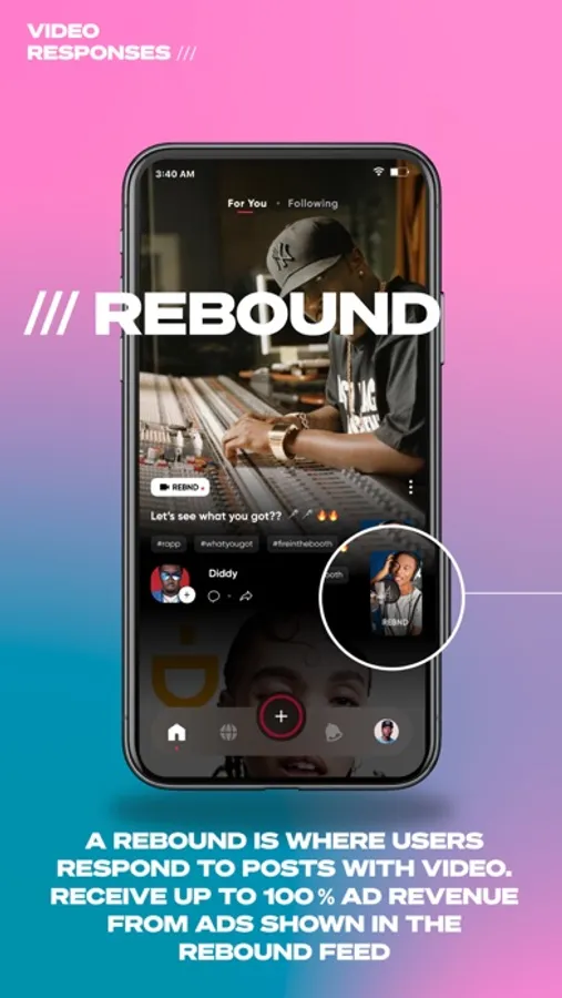 A video platform where creators earn up to 100% ad revenue and users engage content with video responses we call rebounds