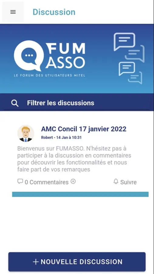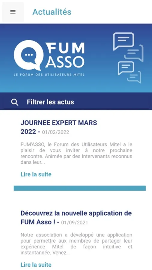 Fum'Asso est une association regroupant des utilisateurs de solutions Mitel. Grâce à l'application, les membres de l'association peuvent partager leurs expériences et leurs connaissances sur l'utilisation des produits Mitel.