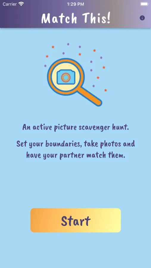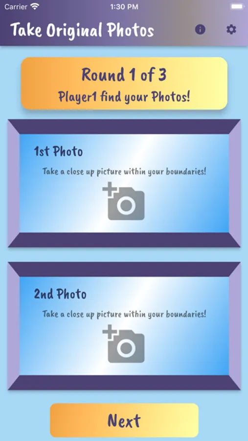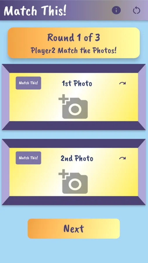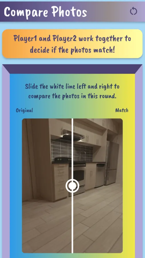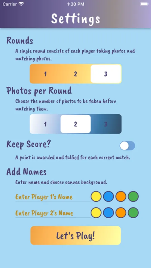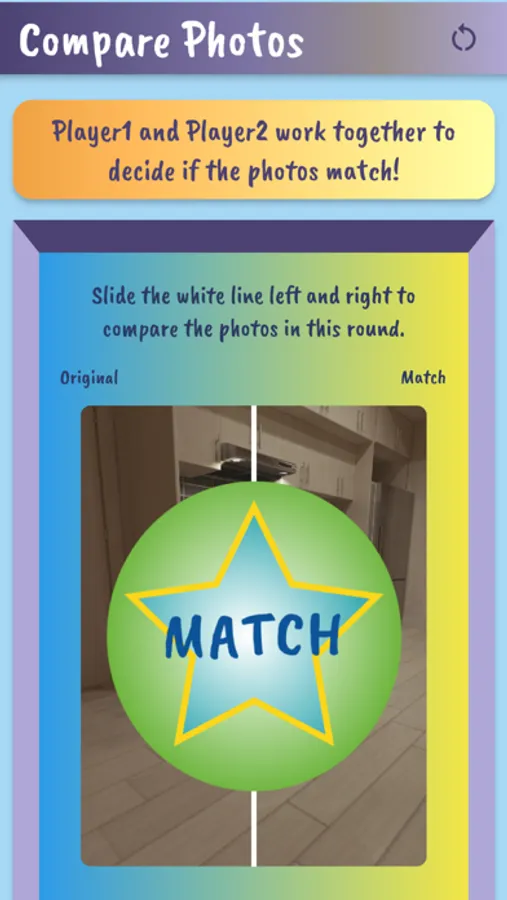 Played on the same device, players take turns using the device camera to capture closeup objects in a designated area. Player 1 takes pictures and has Player 2 tries to match each one. Players work cooperatively to compare the photos and if it is determined to be a match, a point is awarded to Player 2. The players then switch and Player 2 takes the original photos for Player 1 to match. Choose the number of rounds, pictures per round and whether or not to keep score. Players can customize by adding their name and picking a canvas color on the settings page.