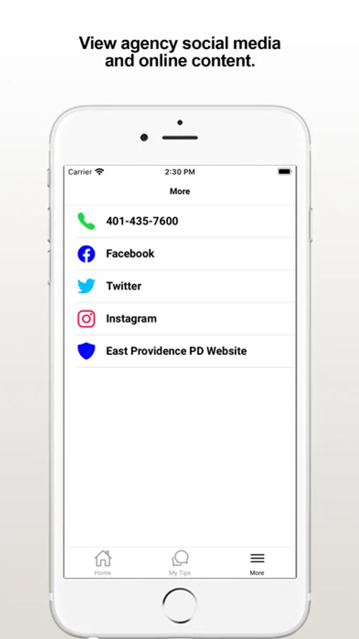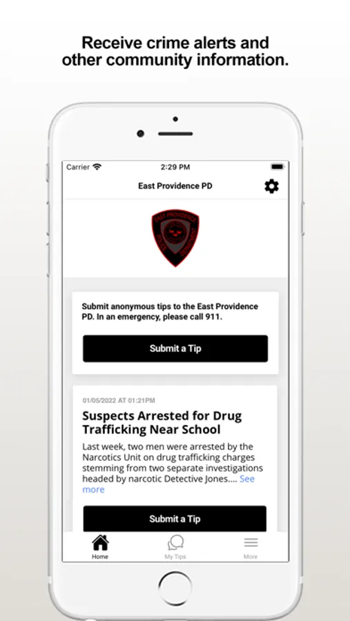 The East Providence PD app provides citizens the ability to submit anonymous tips to the East Providence, RI Police Department. The app also displays agency crime alerts and other organization web and social media content.