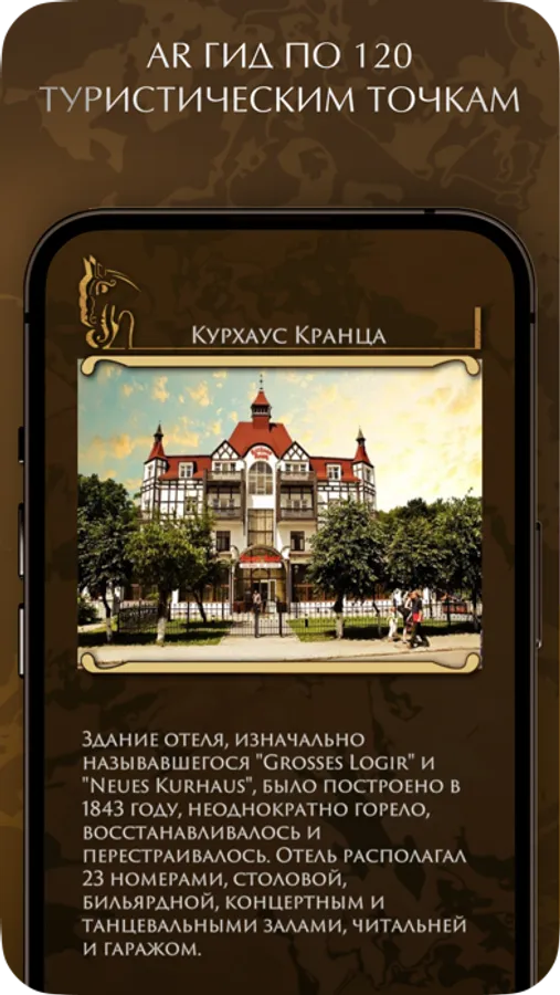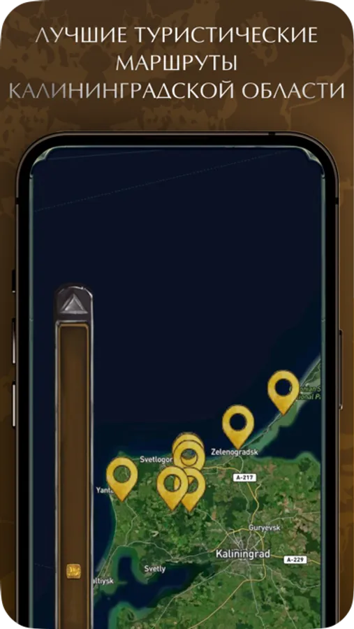 Application guide for tourist routes in the Kaliningrad region and Poland. The application includes 12 tourist routes from more than 120 tourist points.