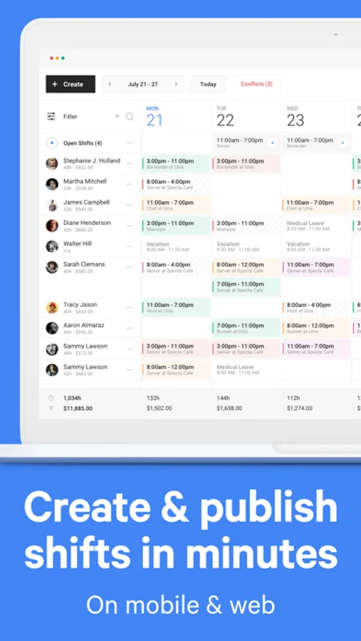 Build your employee schedule faster by taking into account staff vacation, availability, payroll costs, and more.