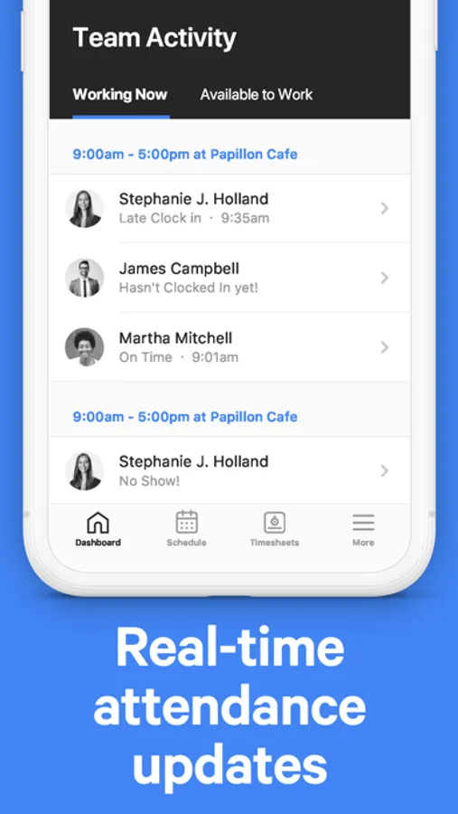 Make sure you’re always covered. Find out in real-time who's on the clock, who’s running late or who's available to work.
