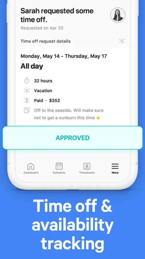 Stay on top of your team’s time off. Easily approve or reject requests and avoid scheduling conflicts.