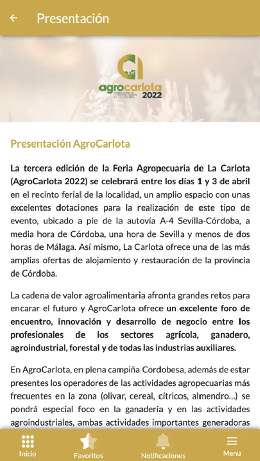La tercera edición de la Feria Agropecuaria de La Carlota (AgroCarlota 2022) se celebrará entre los días 1 y 3 de abril en el recinto ferial de la localidad, un amplio espacio con unas excelentes dotaciones para la realización de este tipo de evento, ubicado a píe de la autovía A-4 Sevilla-Córdoba, a media hora de Córdoba, una hora de Sevilla y menos de dos horas de Málaga. Así mismo, La Carlota ofrece una de las más amplias ofertas de alojamiento y restauración de la provincia de Córdoba.