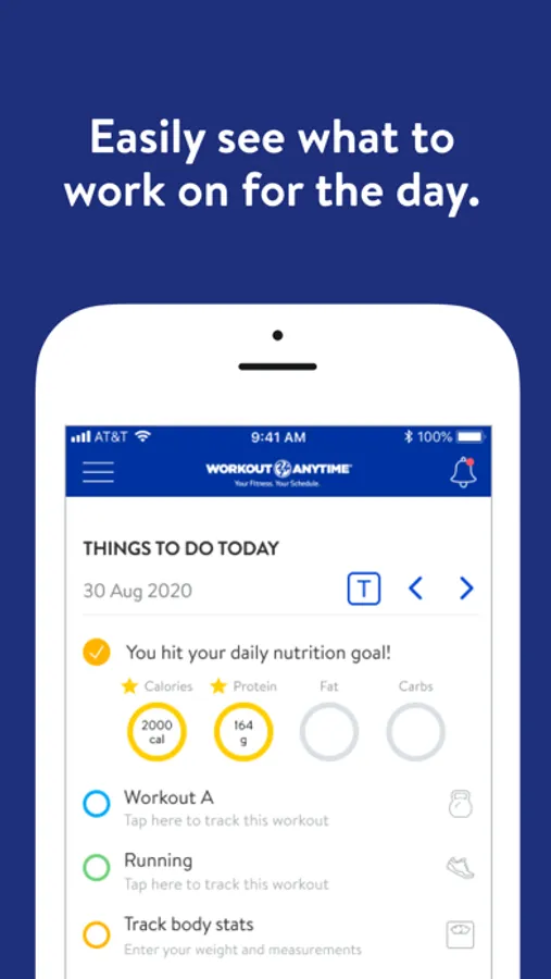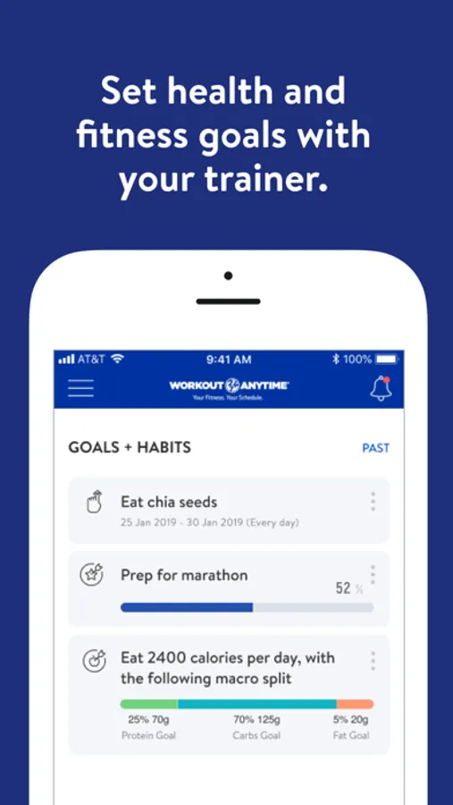With the Workout Anytime Go App, you can start tracking your workouts and meals, measuring results, and achieving your fitness goals, all with the help of your personal trainer.