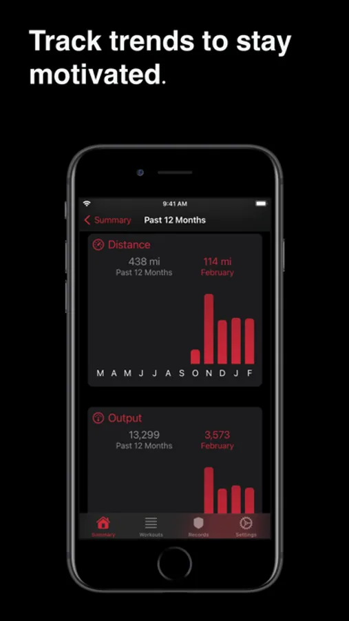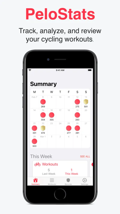 - Workout calendar with personal records, active days, and your total output