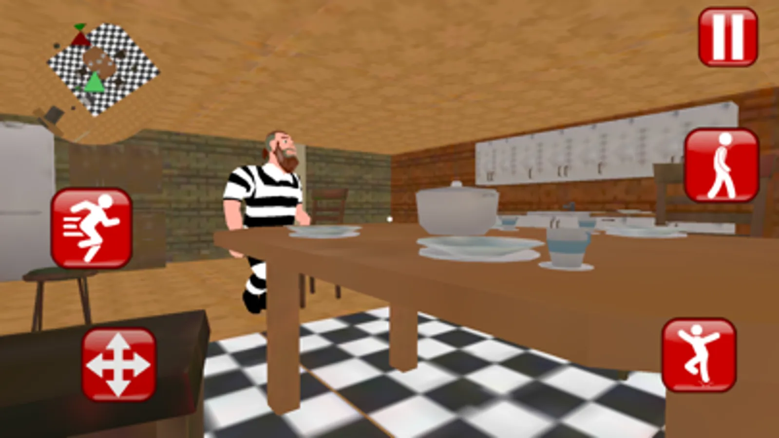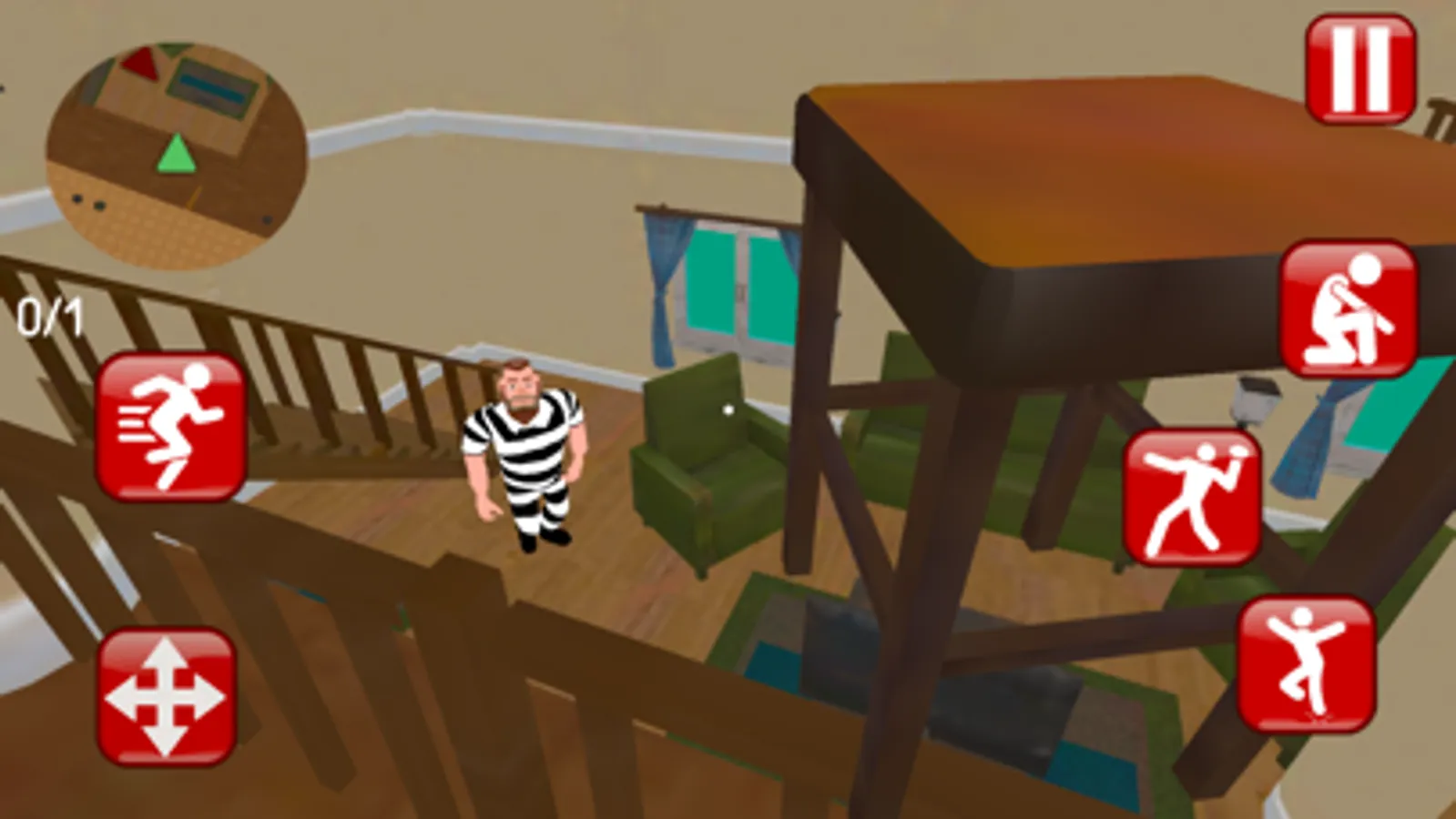 Your character must sneak to prisoner's house unnoticed. If he sees you, he will catch you! Run away if he's chasing you! You can run and hide in your house. Feel yourself like a detective in your strange neighbor's house.