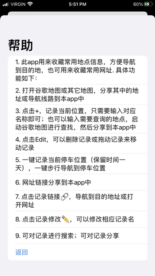 1. 此app用来收藏常用地点信息,方便导航到目的地,也可用来收藏常用网址. 具体功能如下:
