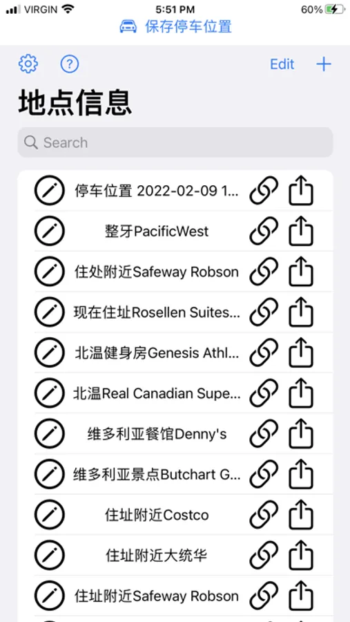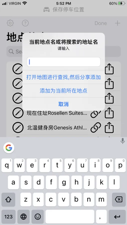 3. 点击+,记录当前位置,只需要输入对应名称即可;也可以输入需要查询的地点,启动谷歌地图进行查找,然后分享到本app中