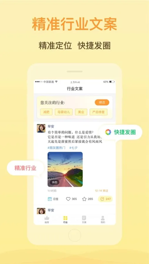 包括早安、晚安、节日、励志、有趣,以及一些热门行业素材
