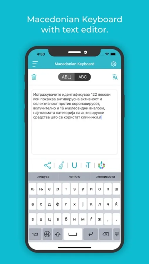 • Once you start typing, you can underline, colour or change the font of any letter to emphasise or de-emphasise it in this best Macedonian Keyboard And Translator for iOS.