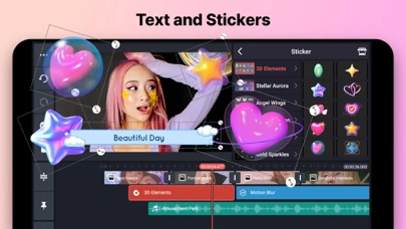 • Make great video with sound effects, video effects, transition effects, stickers, text titles, clip graphics, green screen videos, audio effects and alpha images.