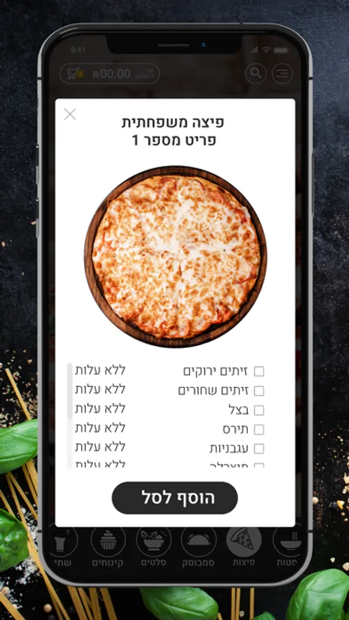 זה נכון גם לפיצה מרגריטה הקלאסית הכוללת פיצה טבעונית ופיצה ללא גלוטן בגודל משפחתי או ענקי, שעשויה מרוטב עגבניות טרי-טרי לפי מתכון שלנו ומ-100% גבינה אמיתית, ונכון גם לפיצות המיוחדות שלנו.