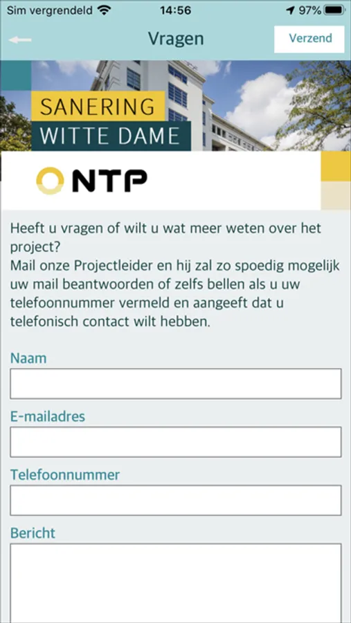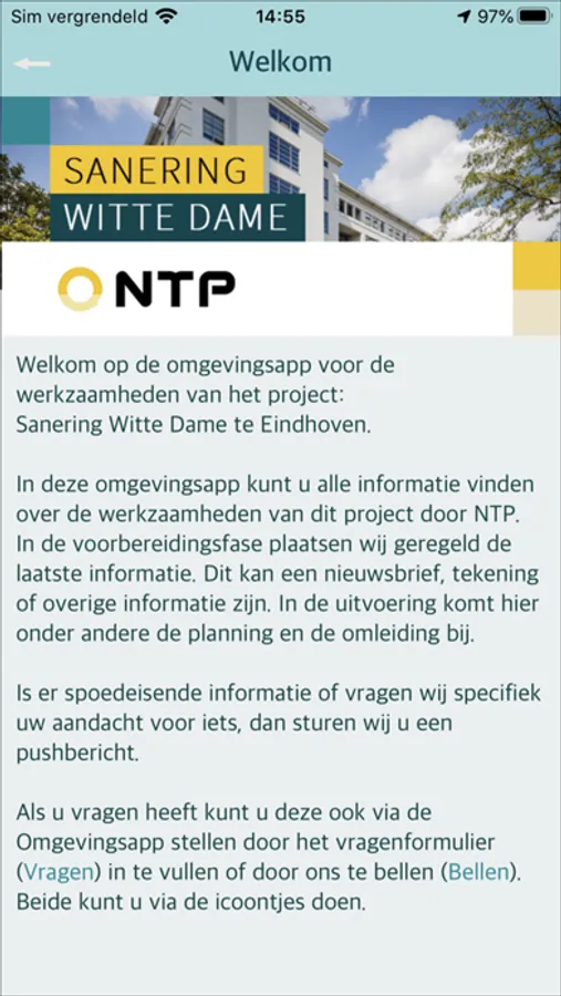 In deze app vindt u alle informatie over de werkzaamheden van het project 'Sanering Witte Dame' te Eindhoven. Er wordt belangrijke projectinformatie, de laatste planning en contactinformatie weergegeven. Ook kunt u op deze app vragen, opmerkingen of klachten achterlaten die betrekking hebben op het project.