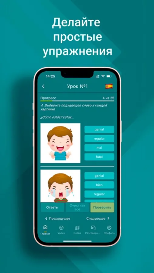 Чтобы изучение испанского языка было более эффективным делайте простые упражнения. Каждый урок содержит около 30 интерактивных упражнений.