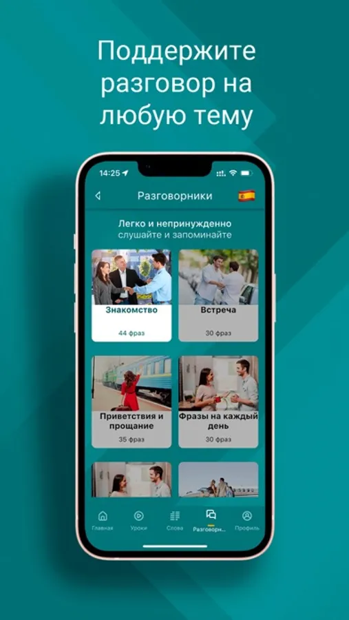 Для различных жизненных ситуаций предлагаются тематические аудио разговорники. В каждом разговорнике около 30 испанских фраз с переводами, записанных профессиональными дикторами. Просто слушайте и запоминайте!