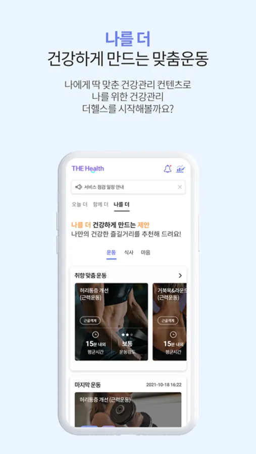 - 나에게 맞는 다이어트, 체형교정 등 다양한 운동 추천/기록이 가능해요.