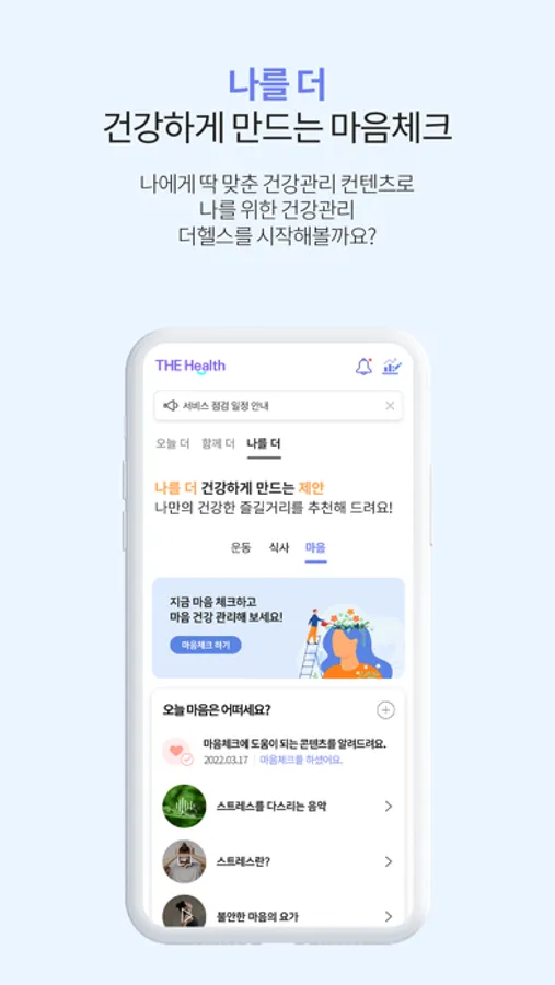 나의 건강상태를 체크하고, 운동, 식사, 마음관리 등 건강습관을 만들어 가는