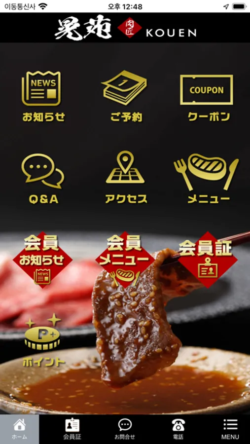 青森県八戸市六日町22-2 男山ビル1Fにあります仙台牛A-5取扱焼肉店の肉匠晃苑(こうえん)です。来店ポイントが貯まると割引クーポンをもらえます。予約も簡単。全室個室でゆったりとお召し上がりいただけます。