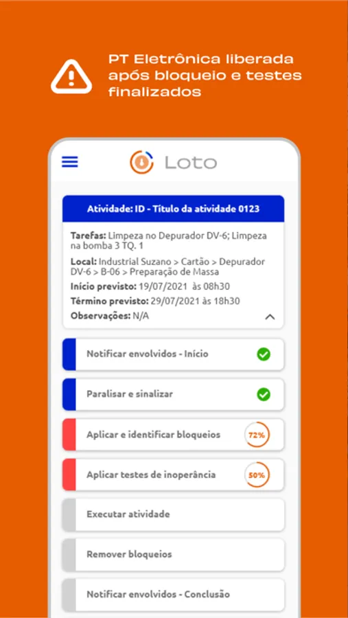 - Associar Atividades com LOTO a uma Permissão de Trabalho Eletrônica, não permitindo o início da atividade enquanto os pontos envolvidos não estiverem bloqueados e testados.