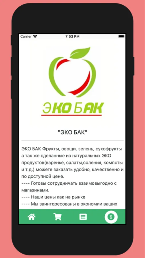 ЭКО БАК Фрукты, овощи, зелень, сухофрукты а так же сделанные из натуральных ЭКО продуктов(варенье, салаты, соления, компоты и т.д.) можете заказать удобно, качественно и по доступной цене.