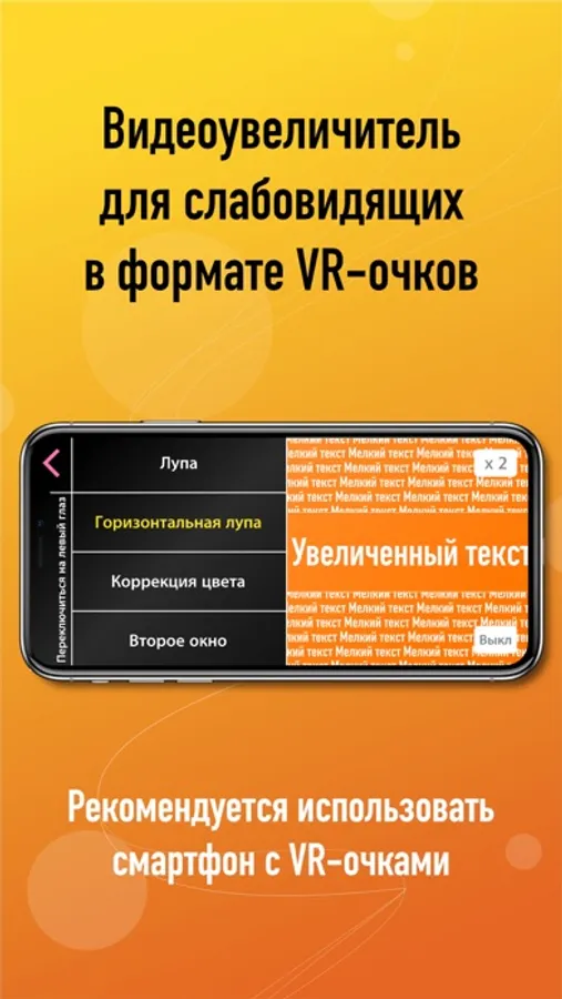 The application can be used as corrective glasses - for this you need to insert a smartphone into any mobile virtual reality glasses.