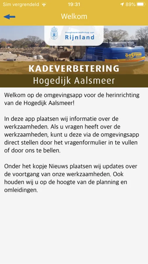 In deze app vindt u alle informatie over de werkzaamheden van het project 'Kadeverbetering Hogedijk' in Aalsmeer. Er wordt belangrijke projectinformatie, de laatste planning en contactinformatie weergegeven . Ook kunt u op deze app vragen, opmerkingen of klachten achterlaten die betrekking hebben op het project.