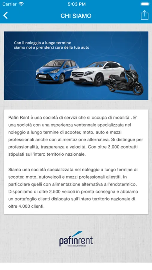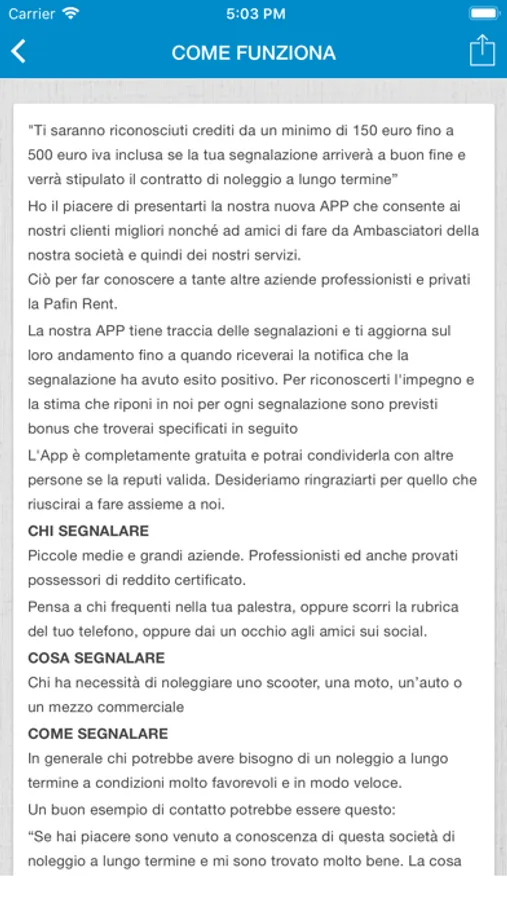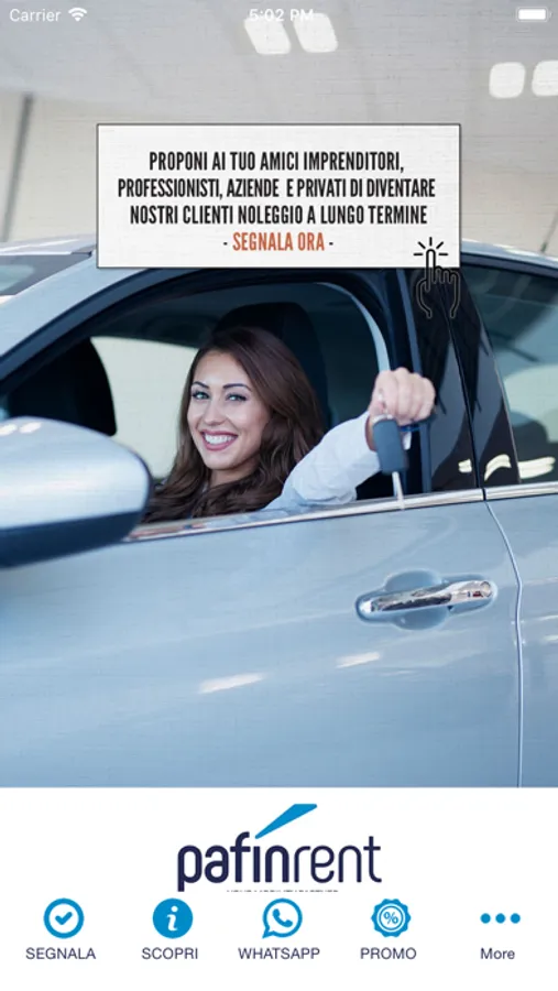 Ho il piacere di presentarti la nostra nuova APP che consente ai ns clienti migliori nonchè ad amici di fare da Ambasciatori della nostra società e quindi dei nostri servizi. Ciò per far conoscere a tante altre aziende professionisti e privati la Pafin Rent. La ns APP tiene traccia delle segnalazioni e ti aggiorna sul loro andamento fino a quando riceverai la notifica che la segnalazione ha avuto esito positivo. Per riconoscerti l'impegno e la stima che riponi in noi per ogni segnalazione sono previsti bonus che troverai meglio specificati nelle condizioni generali e nella presentazione dell'APP. L'App è completamente gratuita e potrai condividerla con altre persone se la reputi valida. Desideriamo ringraziarti per quello che riuscirai a fare assieme a noi. Pafin Rent è una società di servizi che si occupa di mobilità. E' una società con una esperienza ventennale specializzata nel noleggio a lungo termine di scooter, moto, auto e mezzi professionali anche con alimentazione alternativa. Si distingue per professionalità, trasparenza e velocità. Con oltre 3.000 contratti stipulati sull'intero territorio nazionale
